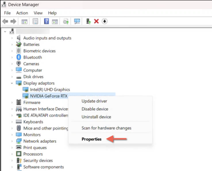 - Expand the Display adapters section. * Right-click your NVIDIA GPU—e.g., NVIDIA GeForce RTX 3090—and select Properties.