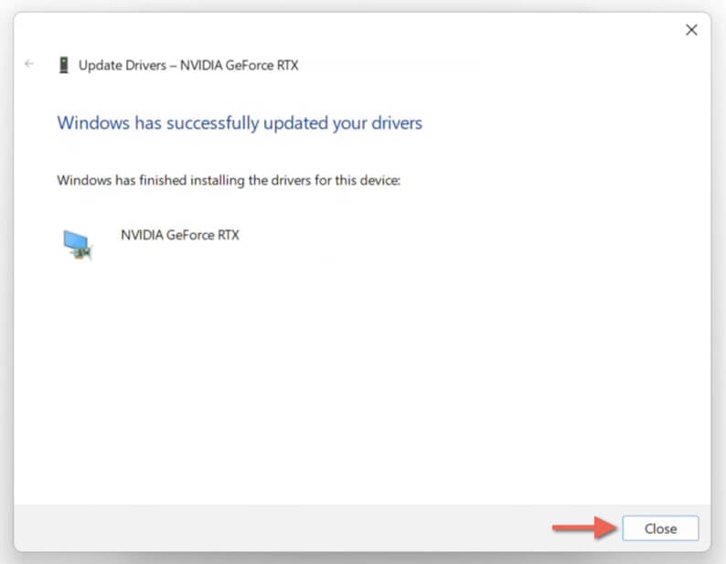 - Wait until Windows finishes rolling back the NVIDIA driver. * Select Close once the Update Drivers wizard says, "Windows has successfully updated your drivers."