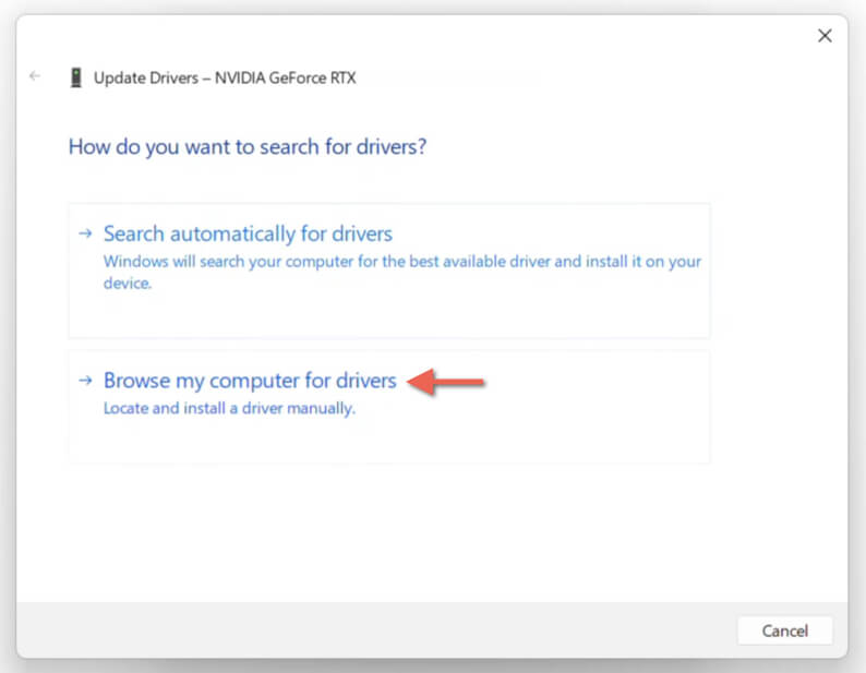 - On the Update Drivers wizard, pick the option labeled Browse my computer for drivers.