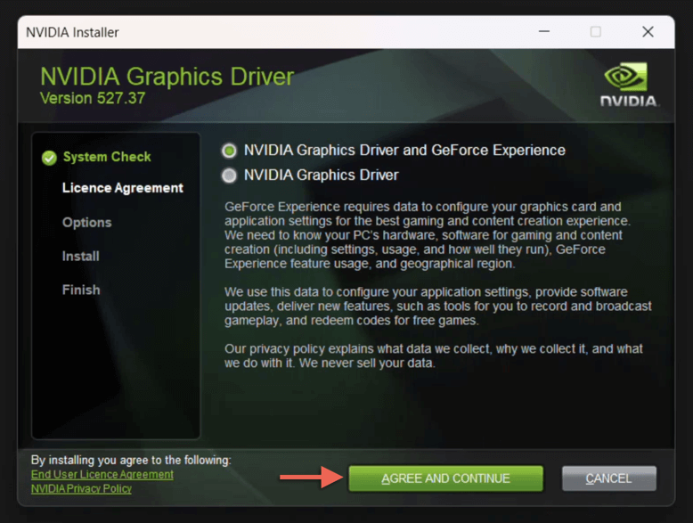 - Select the radio button next to NVIDIA Graphics Driver and GeForce Experience or NVIDIA Graphics Driver—the latter option removes the GeForce Experience app if it’s on your system. * Select Agree and Continue.