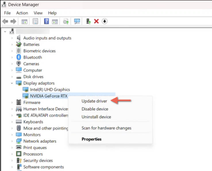 - Expand Display adapters, right-click your NVIDIA graphics card, and select Update driver.