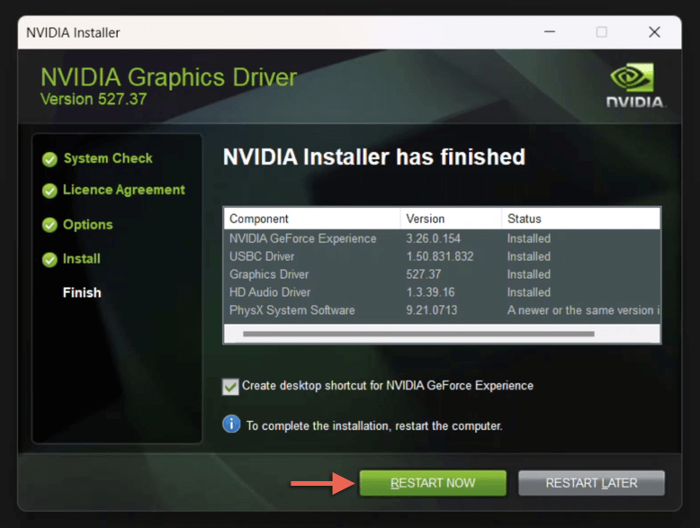 - Wait for the NVIDIA installer to finish downgrading the drivers. * Select Restart Now.