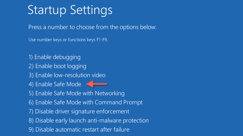 - Wait for your PC to boot into the Windows Recovery Environment. * Select Choose an option > Troubleshoot > Advanced options > Startup Settings > Restart. * Press 4/F4 on the Startup Settings screen to start your PC in Safe Mode without networking.