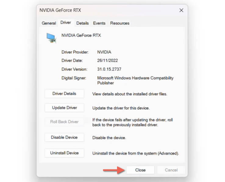 - Wait until Windows finishes rolling back the new driver—the Driver Version field should automatically update and reveal an older version number afterward. * Select Close.