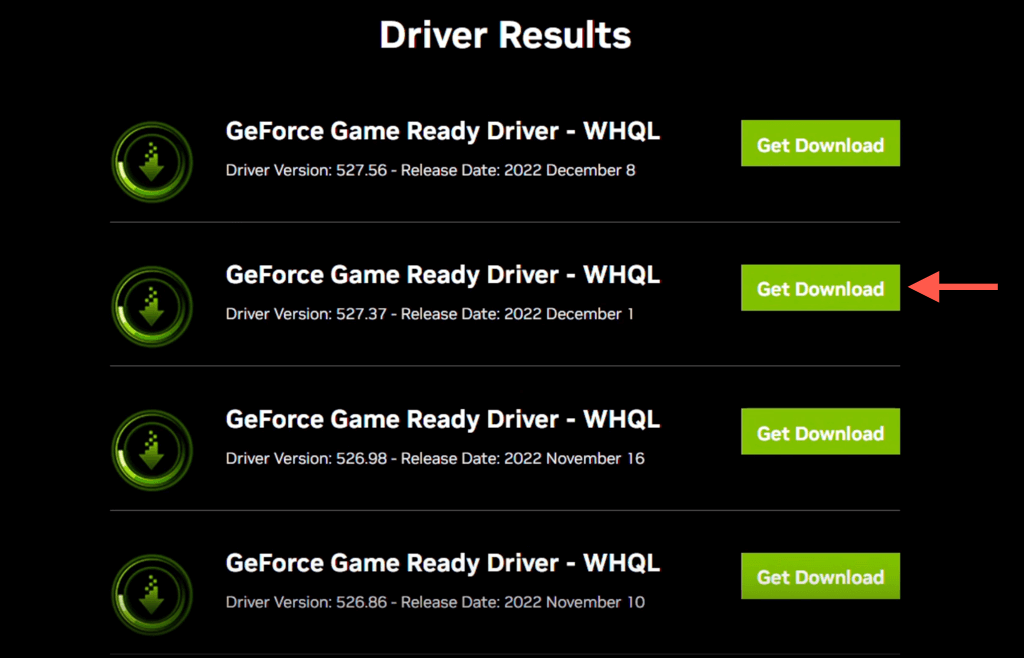 - Look for the driver version you wish to revert to and select Get Download.