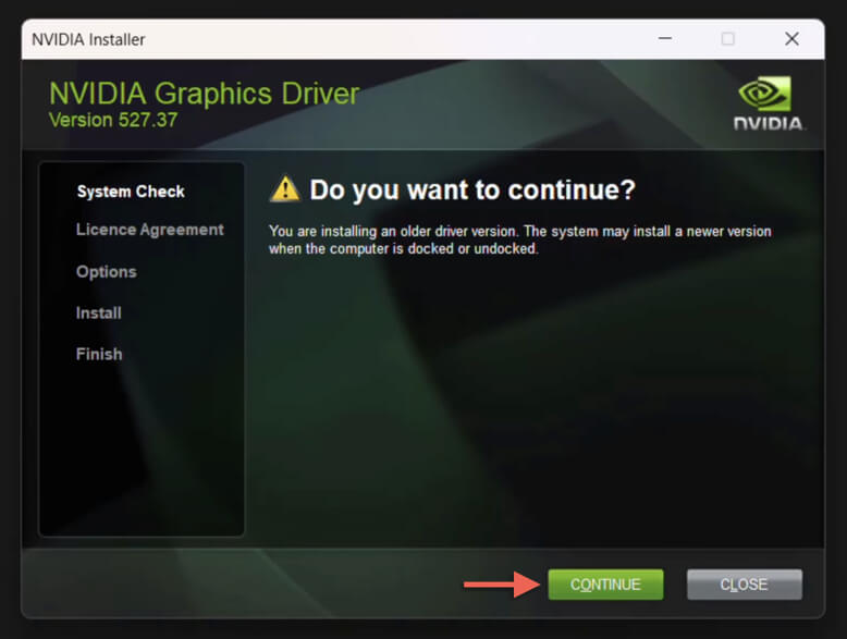 - The NVIDIA installer should detect you’re about to install an older version and prompt you with a "Do you want to continue?" screen—select Continue.
