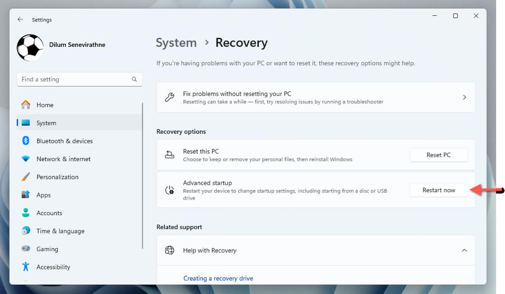 - Go to System > Recovery > Advanced startup and select Restartnow.