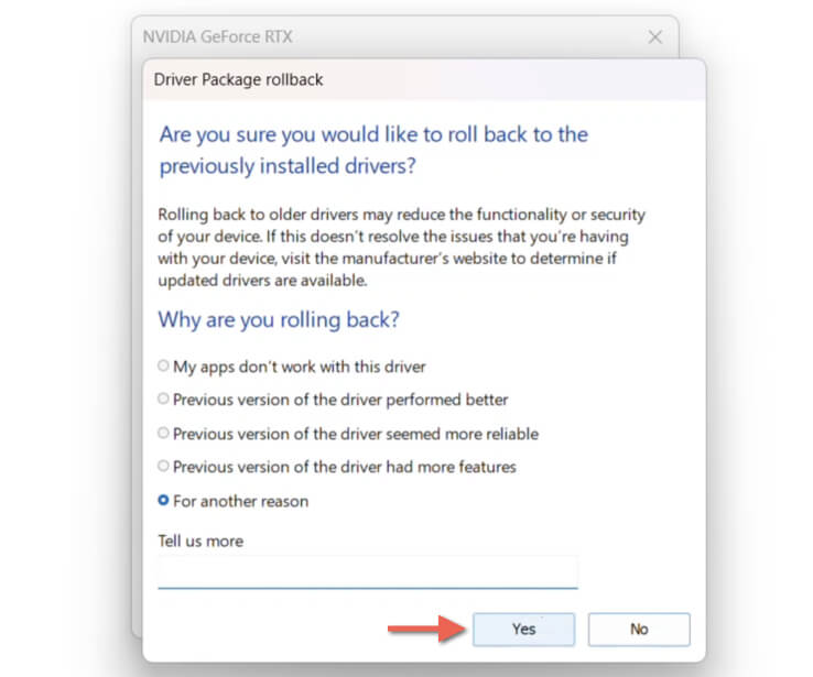 - Pick a reason for rolling back the driver—e.g., Previous version of the driver performed better—and select Yes.