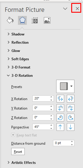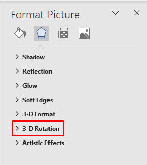 - Right-click your image and go to Format Picture…Go to the 3-D rotation option in the menu.