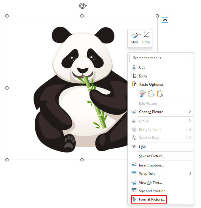 - Open the Image’s options panel by right-clicking on it. Select Format Picture from the menu. It’s located at the bottom.