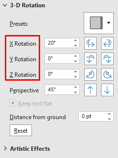 - Under the presets, you’ll notice Rotation options for X, Y, and Z-axis. You can manually type the degree values, or use the arrows.