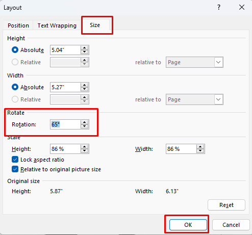 - A Layout dialog box will appear. Select the Size tab, and find the Rotation option. Here you can enter the exact angle you want to rotate your image in. Either type the number or use the small arrows on the side to find the desired angle.