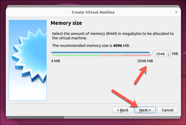 - Next, you’ll need to allocate memory (RAM) for your virtual machine. Keep in mind that the more RAM you allocate, the better your virtual machine will perform. However, don’t allocate more RAM than your host system can handle. You can always change this later, if needed. Press Next to proceed.