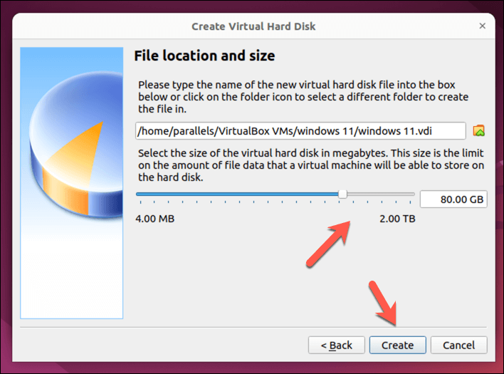 - Next, choose the location for the hard drive file and the size of the drive and press Create to proceed. Make sure to make the file big enough to handle the operating system you plan to install.