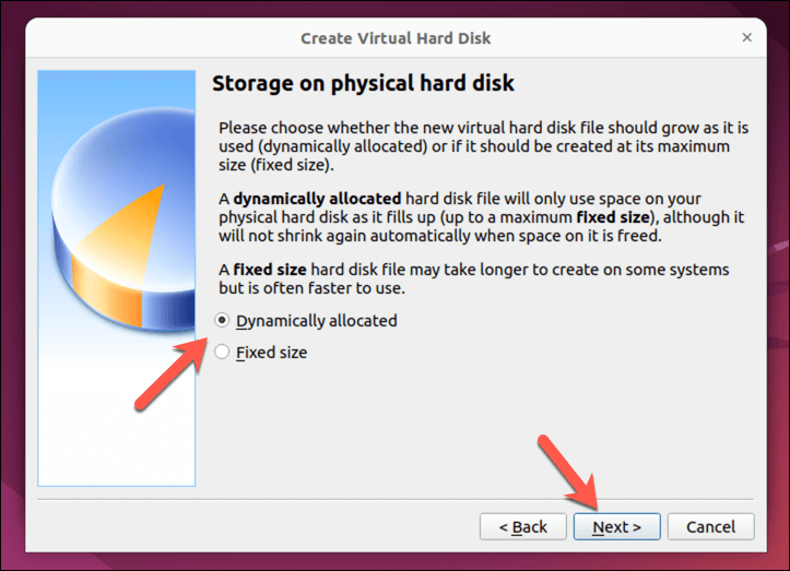 - You can choose to make the hard drive file a fixed size or use dynamic allocation, meaning that the file will grow as the data on your virtual machine grows. Select your preferred option and press Next.