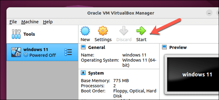 - To start your virtual machine, select it in the list and click the Start button at the top of the window. The virtual machine will boot up and display the chosen operating system.