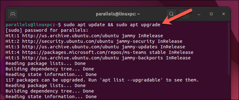 - Otherwise, on Ubuntu or Debian-based distros, open a new terminal window on your Linux PC and run the sudo apt update && sudo apt upgrade commands in your terminal. This will ensure your PC is up-to-date.