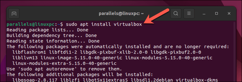 - Next, install VirtualBox by running the sudo apt install virtualbox command in the terminal. This will begin the installation—press Y to confirm.