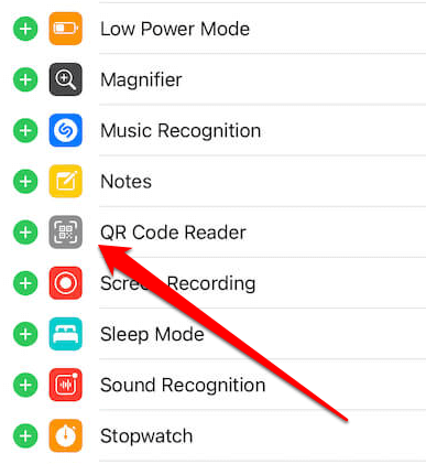 - Tap the **green + (plus) icon** next to the **QR Code Reader** (or Scan QR Code) to add it. You can access the feature from the Control Center anytime you want.