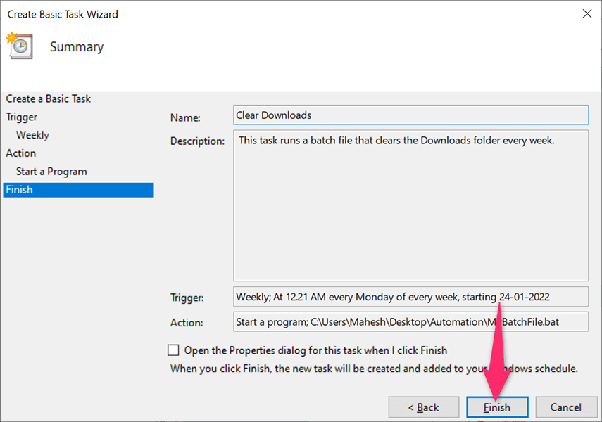 You’ll see your newly created task’s summary on your screen. Click the Finish button if this summary looks good to you.