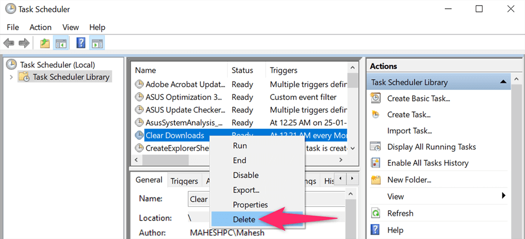 Lastly, you can get rid of your task so that your batch file doesn’t automatically run. You can do this by right-clicking your task on Task Scheduler’s main window and choosing Delete from the menu.