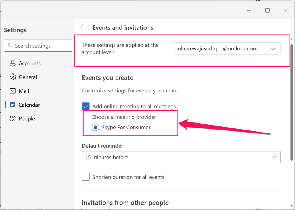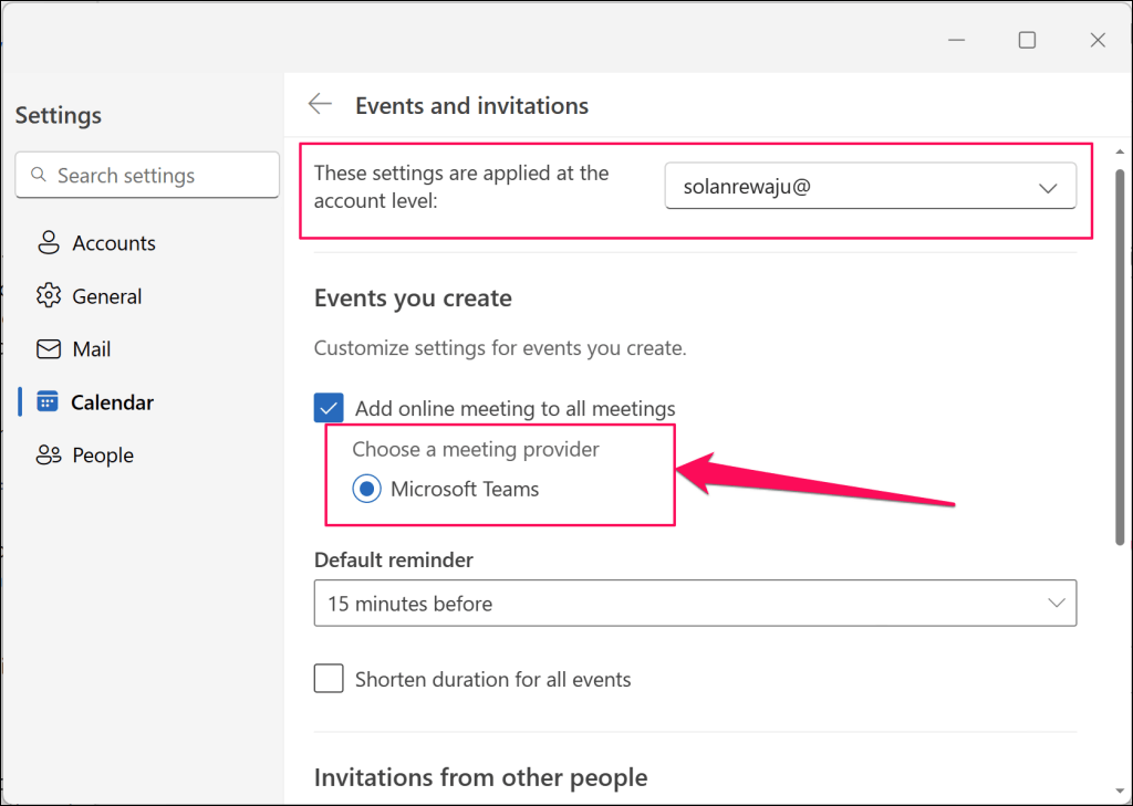 - Check the “Events you create” section for your organization’s meeting provider. If you use multiple accounts in the Outlook app, ensure the correct account is selected in the “These settings are applied at the account level” drop-down box.