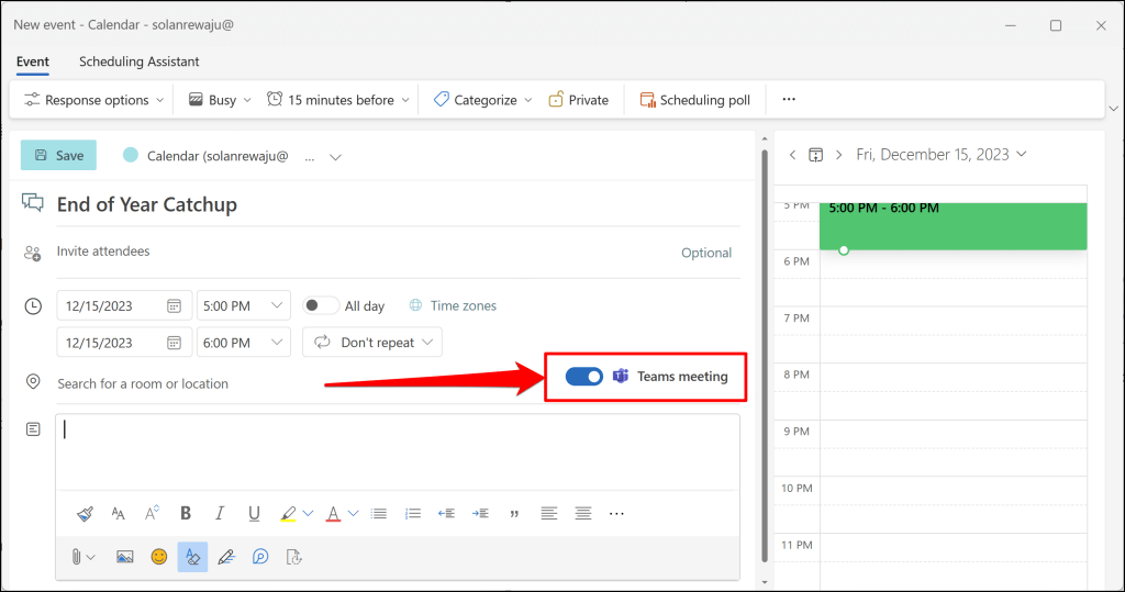 - Toggle on Online Meeting (Teams Meeting), invite attendees and provide the meeting details (date, start/end time, location, description, etc.).