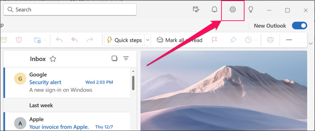 - Open Outlook and select the gear icon in the top corner to open the app’s settings.