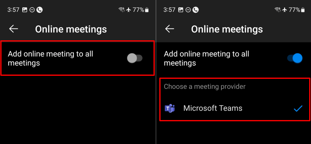 - Tap Online meetings and turn on Add online meeting to all meetings to see your organization’s meeting provider.
