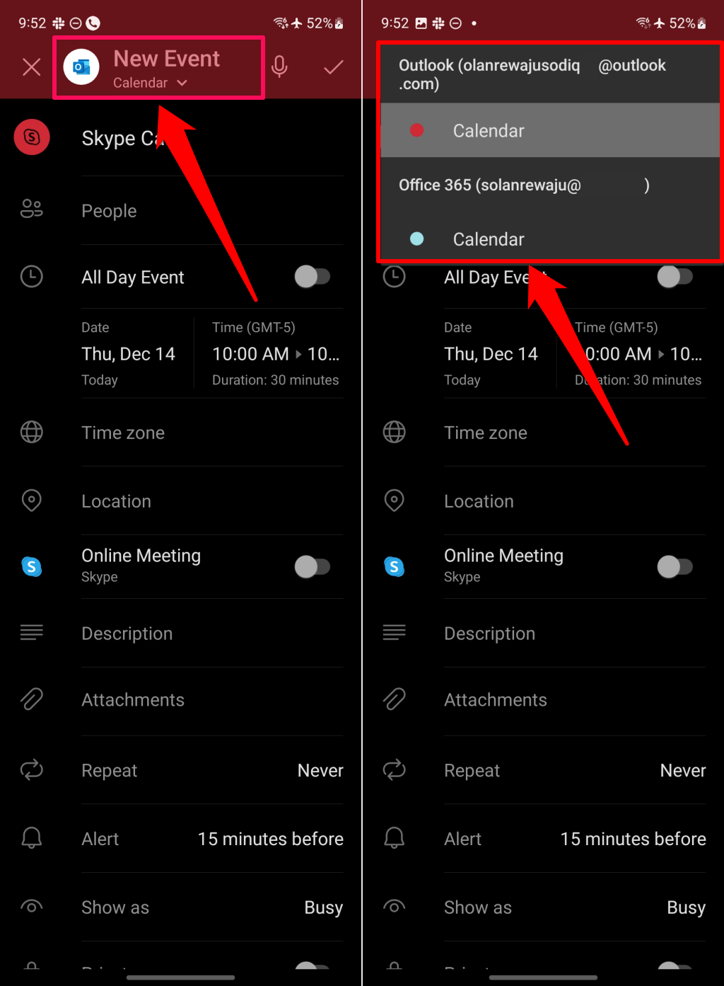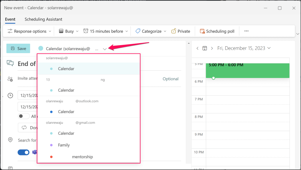 If you have multiple accounts linked to your Outlook app, ensure you’re scheduling the meeting from the correct account.