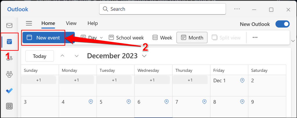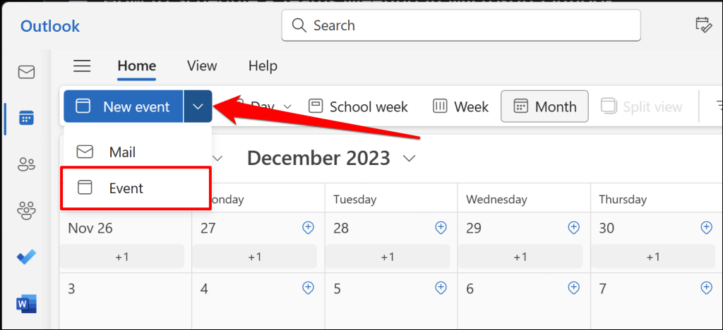 Alternatively, select the drop-down button next to the “New event” button and choose Event.
