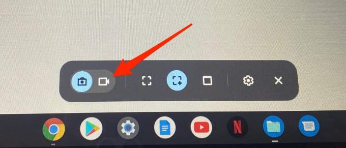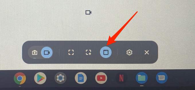 The snipping tool will pop up at the bottom of your screen, just right above the Shelf. Tap the camcorder icon to navigate to the Screen Record menu.