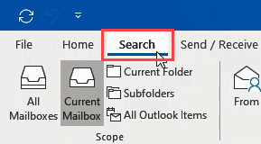 In the Search Tools tab, we can easily set the scope of the search. On the left side, we’ll see that we can set the scope to **All Mailboxes**, **Current Mailbox**,** Current Folder**,** Subfolders**,** **or **All Outlook Items**.