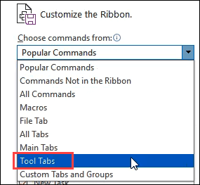 - In the Customize Ribbon pane, click on the dropdown menu under Choose commands from: and select Tool Tabs.