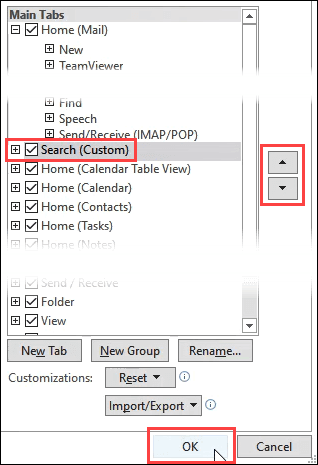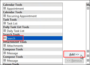 - Search Tools will appear in the Main Tabs area. Use the up and down arrows beside this area to determine where it will appear in the ribbon, or leave it where it is. Then click OK to commit the change.