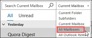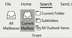 Current Mailbox – choose this scope to keep the search within just the one mailbox. Ensure that the mailbox is selected in the left pane of Outlook.