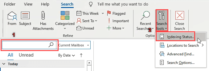 - Click on the **Search Tools **button and then on Indexing Status. A small window will open showing how many emails are left to be indexed.