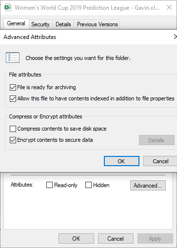 To use EFS to encrypt your file, right-click the Excel spreadsheet and select Properties. Now, select **Advanced, **then check the box to Encrypt contents to secure data. Press OK, then Apply.