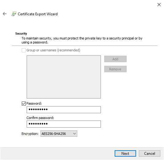 Select Personal Information Exchange from the first page, and check Export all extended properties. On the next page, you must input a secure and unique password to password protect your files. Switch the encryption type to AES256-SHA256 (extremely strong encryption!), then give your encryption key backup a filename. Press Finish to complete the process.
