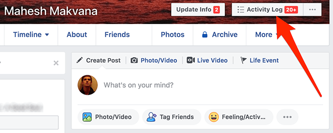 - It’ll open your Facebook profile showing your account information and posts. At the top of your profile right beneath the cover photo, you’ll find a button saying Activity Log. Click on it to open your activity information.