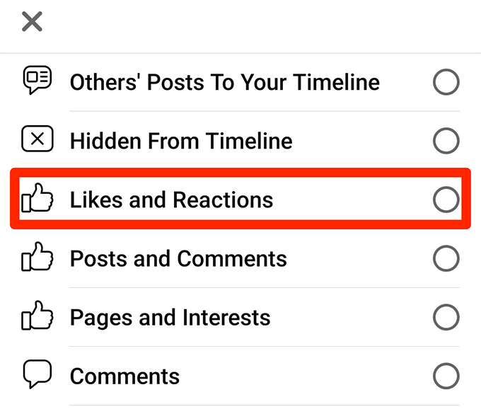 - Select Likes and Reactions from the Category menu to only view your Facebook likes and reactions.