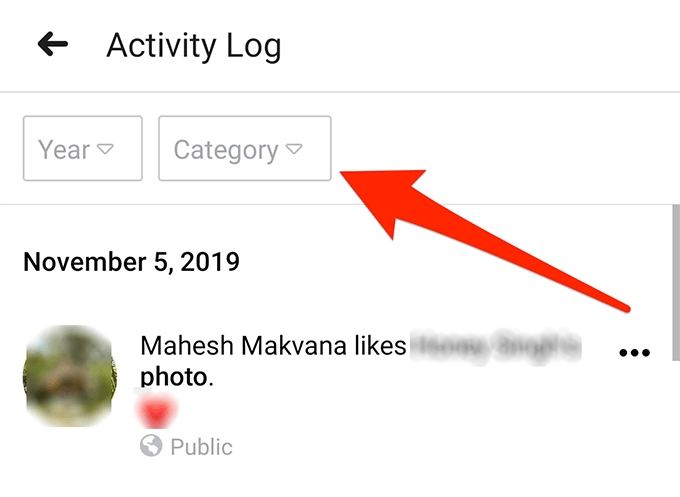 - You’ll now see your Facebook activity on your screen. You’ll want to filter out the unwanted items from the list. Tap on the Category option at the top to do so.