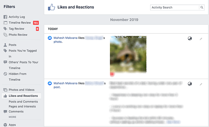 - The following screen lists out each and every activity ever performed by you on Facebook. Since it contains your entire activity and not just your likes, you’ll need to filter the list. On the left-hand side menu, you’ll find various options to filter your activity. Find the option that says Likes and Reactions and click on it.