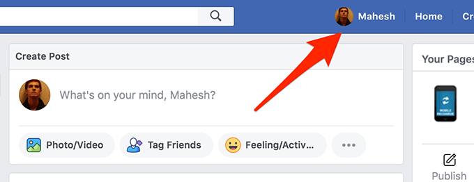 - When the Facebook newsfeed screen opens, click on your profile name at the top menu.