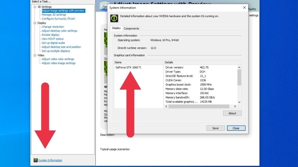 In this example, we’re using the Nvidia Control Panel. By selecting System Information, you’ll get a full list of the GPU’s specifications, including the model name and how much VRAM it has. The AMD and Intel utilities have similar information, so refer to their help files for exact instructions if you don’t see the right section immediately.