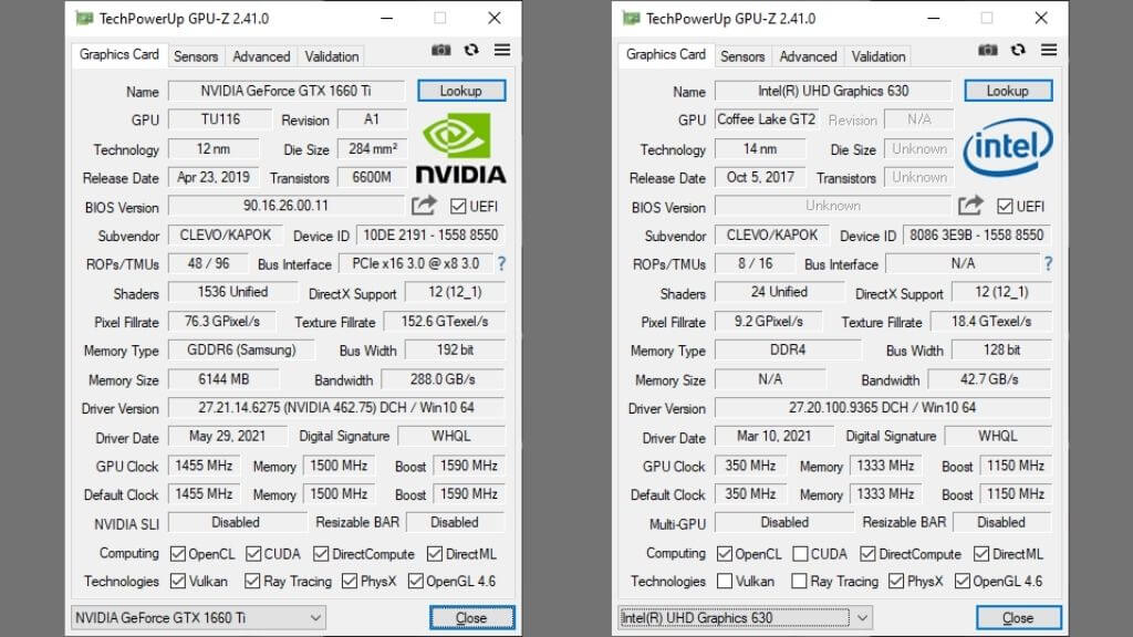 In this example, there are two GPUs listed. Computers can have multiple GPUs in them at the same time. Here we see the integrated Intel GPU and the discrete Nvidia GPU listed next to each other. High-performance laptops dynamically switch between these GPUs to balance power consumption and power use.