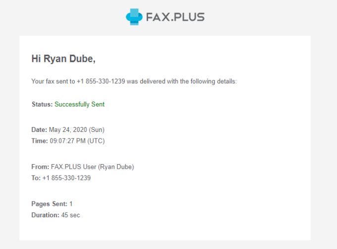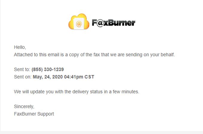 Once you send this email, within less than a minute you should receive a confirmation email back from FaxBurner that your fax was successfully sent.