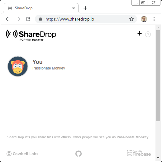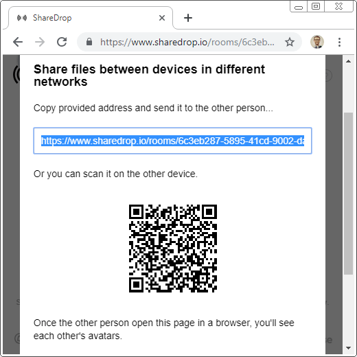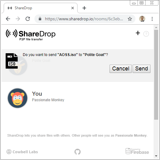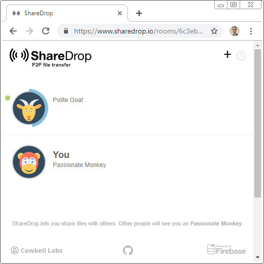 ShareDrop is a blank page where you and other people can join a special link and share files amongst each other. There are no file size limits or any customizations at all. Just choose someone else in the virtual room to send the file to, pick the file from your computer, and have the person confirm to accept and start the P2P file transfer.