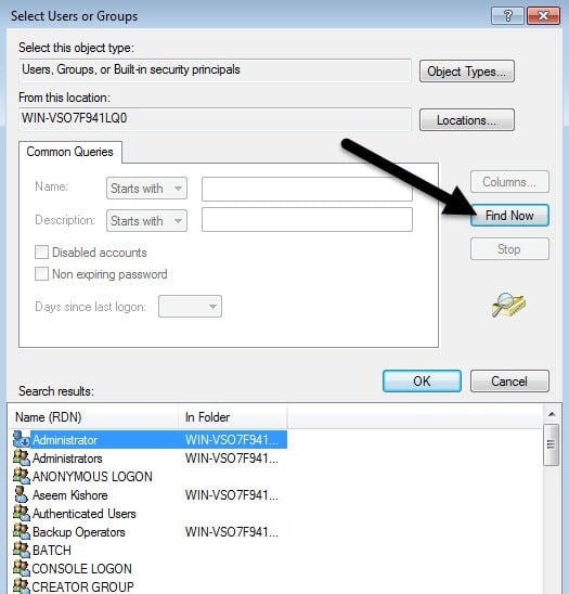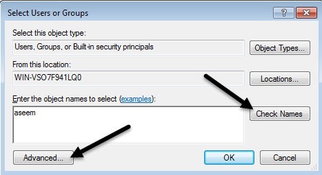 When you click the Add button, you have to type in the user name or group name into the box and then click on** Check Names** to make sure it’s correct. If you don’t remember the user or group name, click on the Advanced button and then just click Find Now. It will show you all the users and groups.
