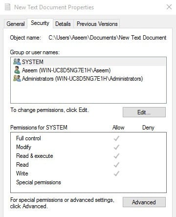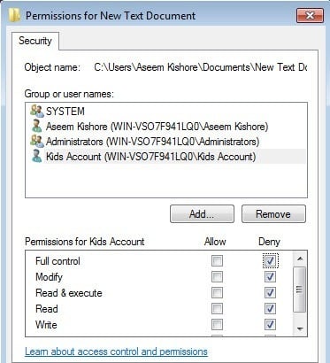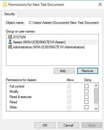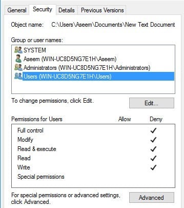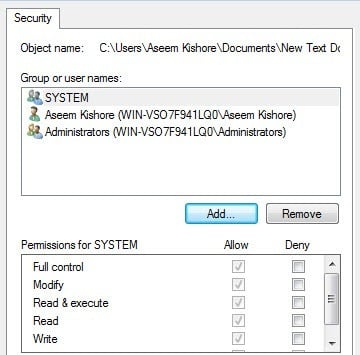The only thing you have to understand now is the Effective Permissions or Effective Access tab. So what is effective permissions? Well, let’s see the example above. I have a text file and my account, Aseem, has Full Control. Now what if I add another item to the list so that the group Users is denied** Full Control**.